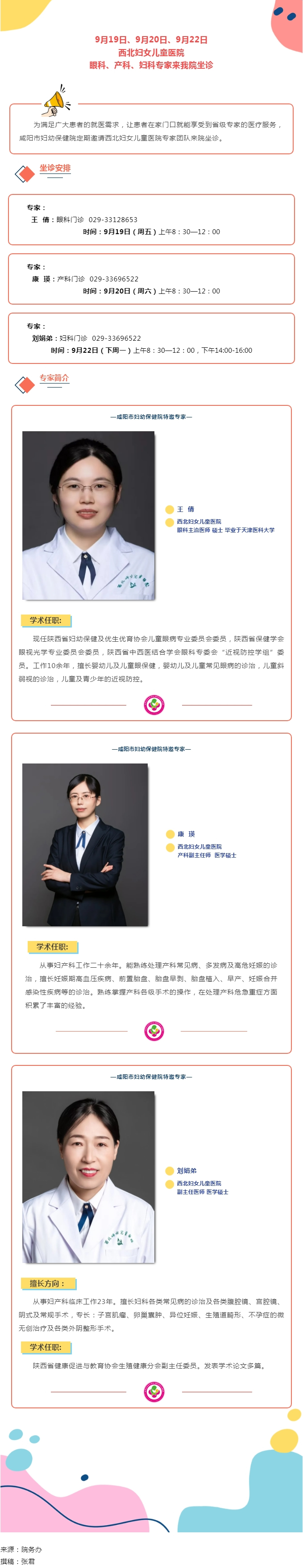 9月19日、9月20日、9月22日西北妇女儿童医院眼科、产科、妇科专家来我院坐诊