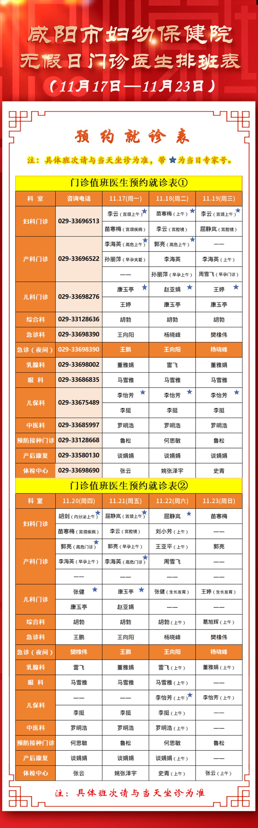 咸阳市妇幼保健院无假日门诊医生排班表(11月17日-11月23日)