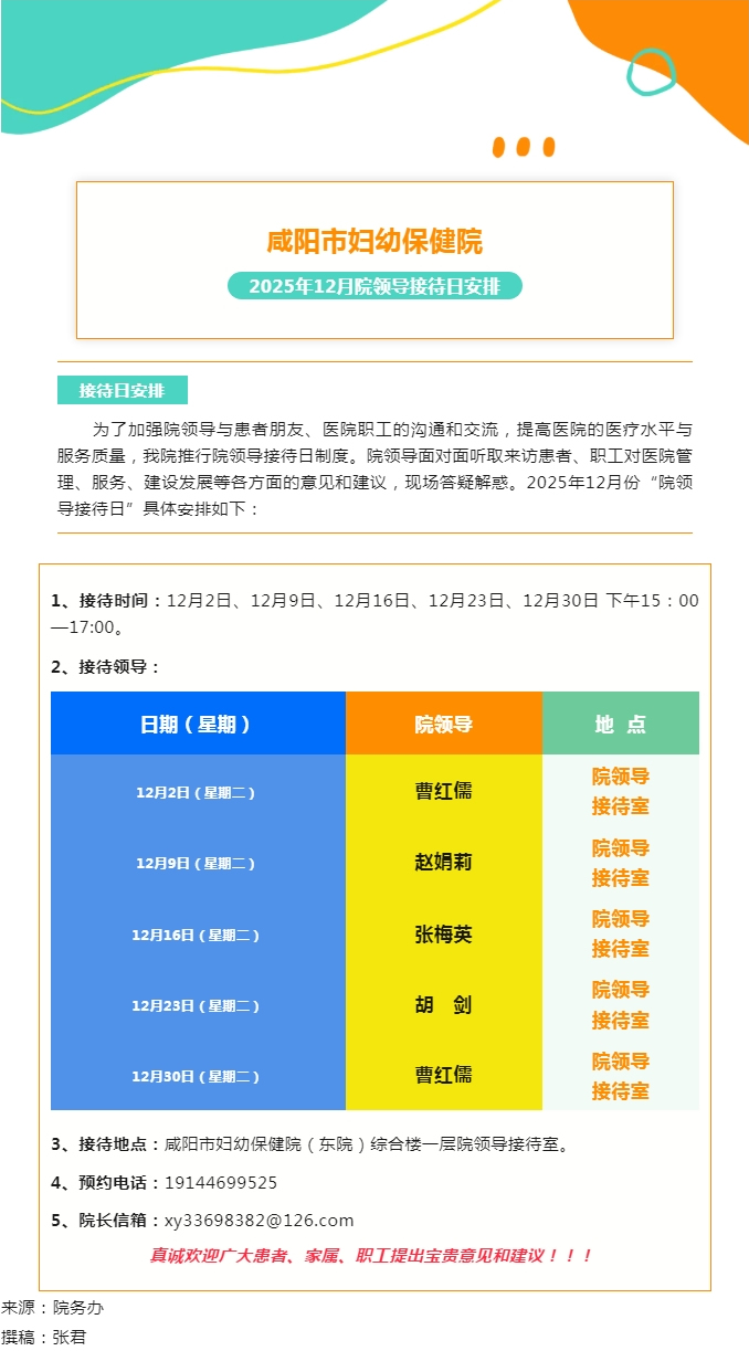 咸阳市妇幼保健院2025年12月院领导接待日安排