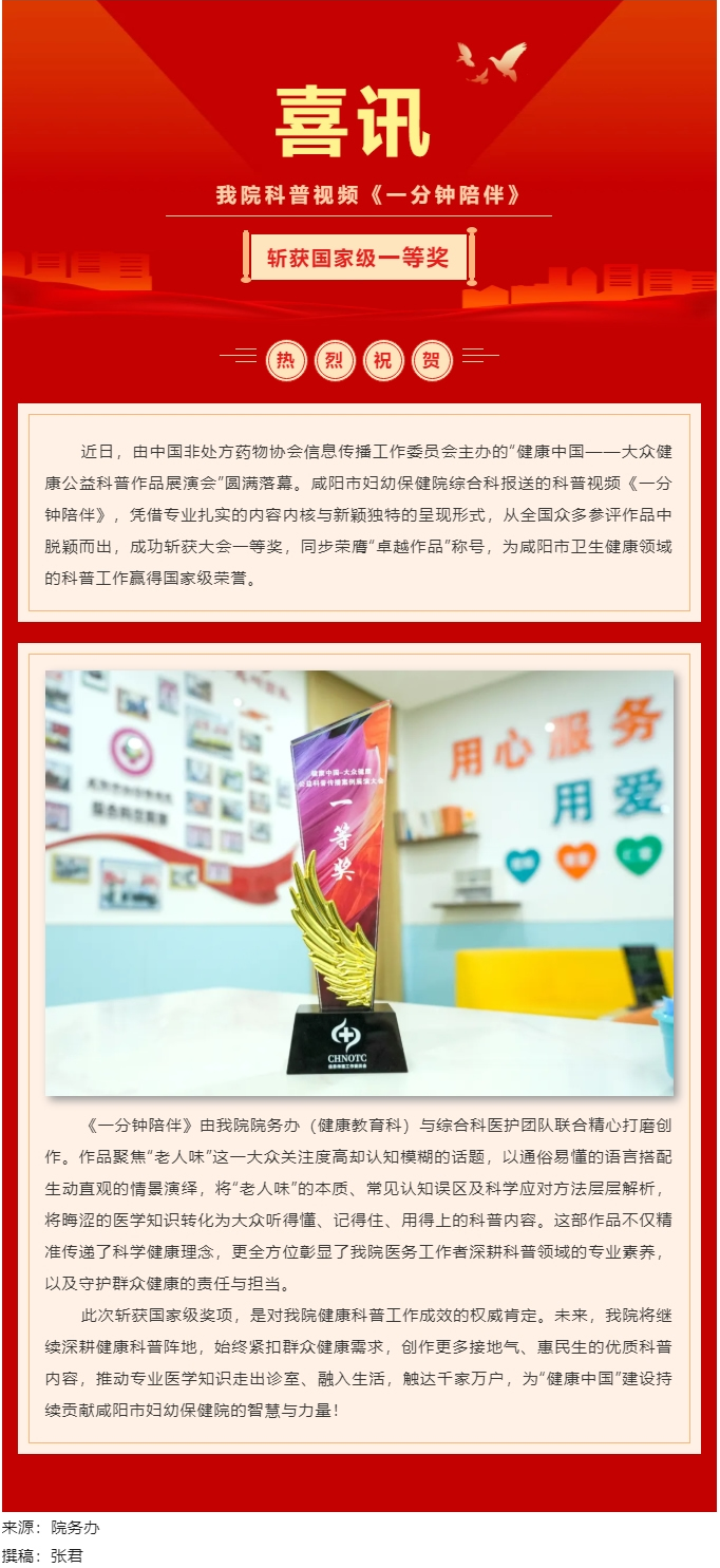 喜讯!我院科普视频《一分钟陪伴》斩获国家级一等奖