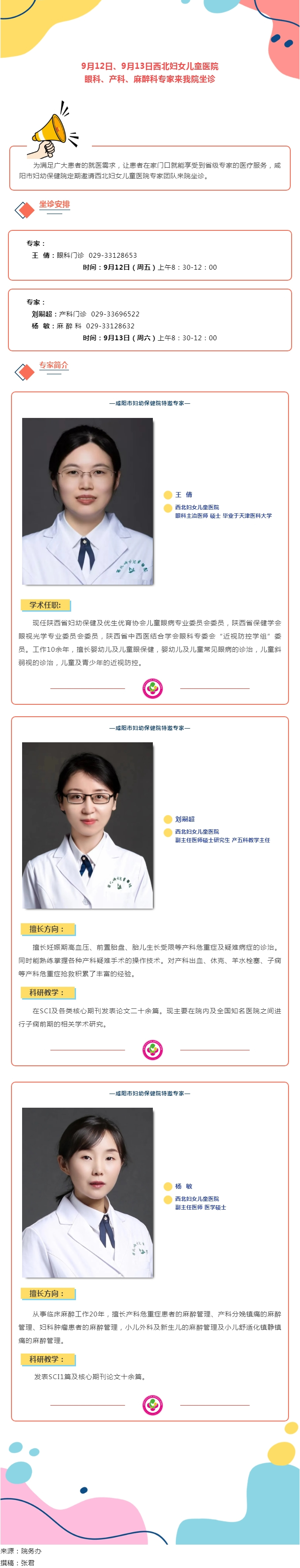 9月12日、9月13日西北妇女儿童医院眼科、产科、麻醉科