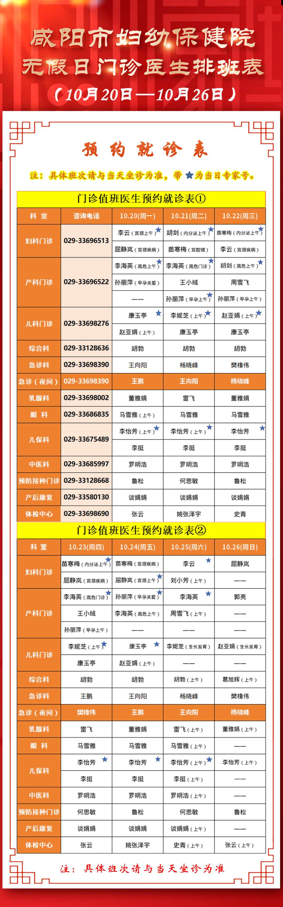 咸阳市妇幼保健院无假日门诊医生排班表(10月20日-10月26日)