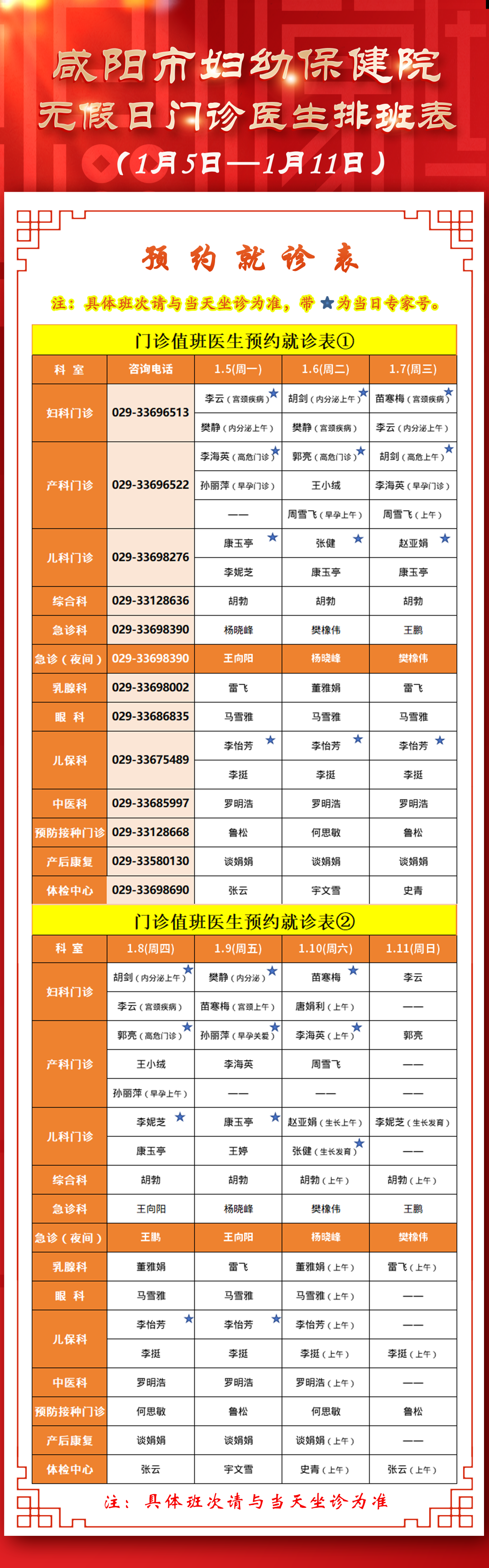 咸阳市妇幼保健院无假日门诊医生排班表(1月5日-1月11日)