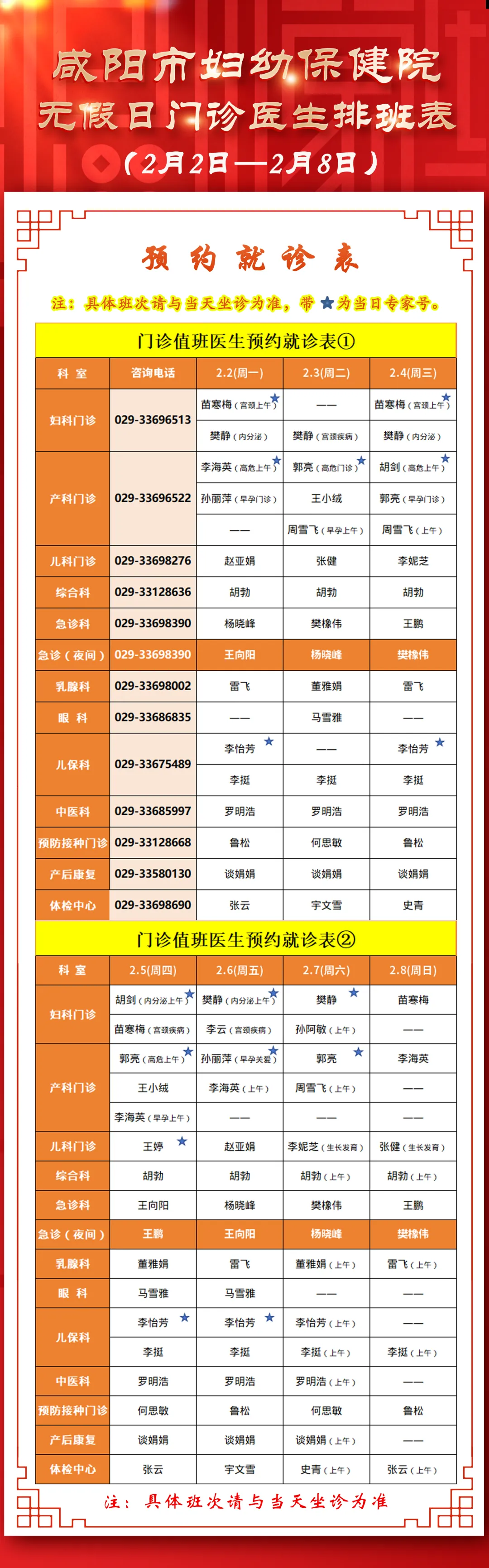 咸阳市妇幼保健院无假日门诊医生排班表(2月2日-2月8日)