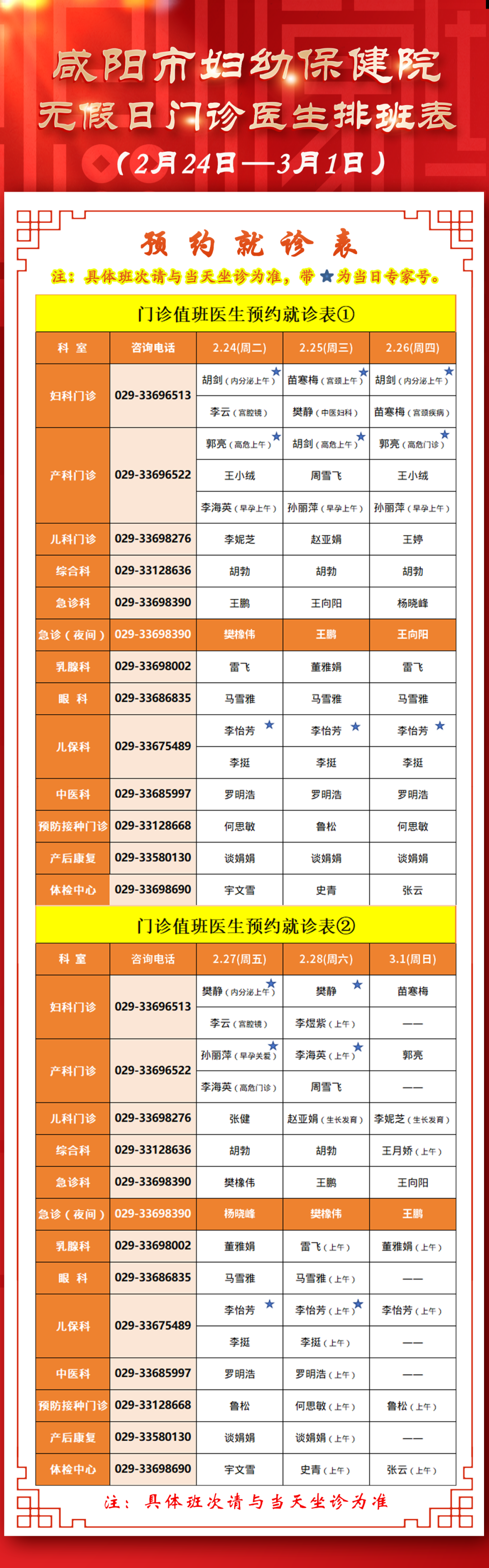 咸阳市妇幼保健院无假日门诊医生排班表(2月24日-3月1日)